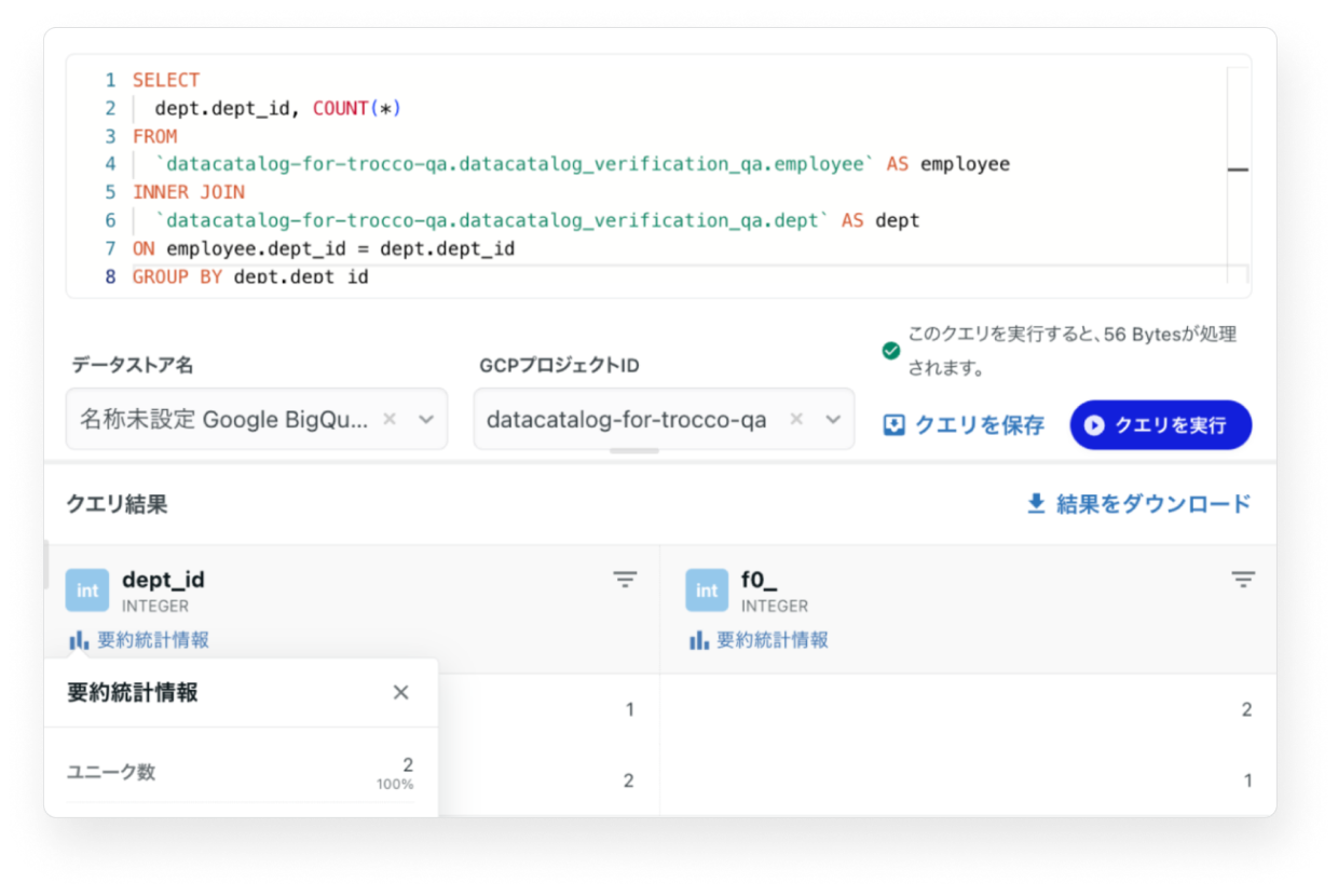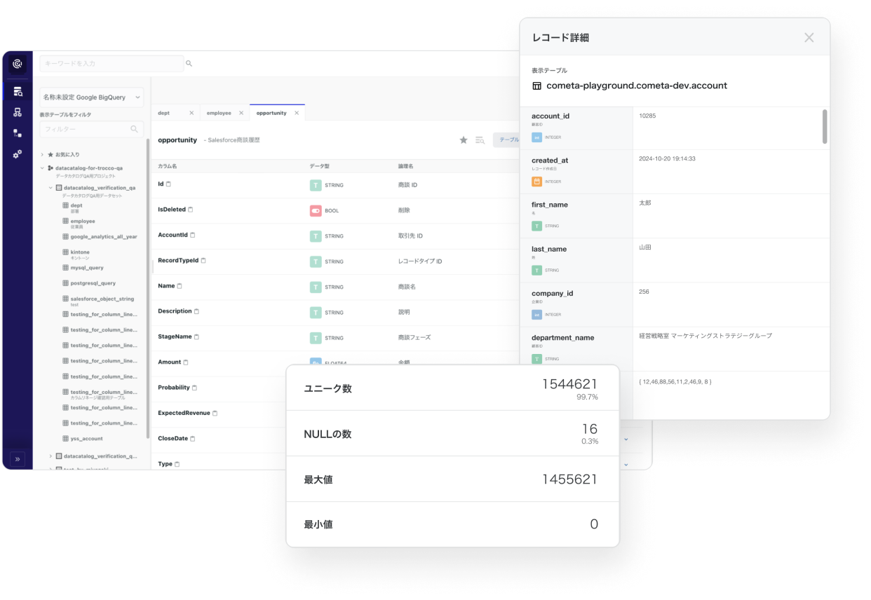 テーブルおよびテーブルに紐づく各カラムの各種メタデータを簡単に確認できます。 加えて、プレビュー機能も充実しています。各カラム内の要約統計情報表示や、テーブルプレビュー上でのフィルター/ソートにも対応しています。
