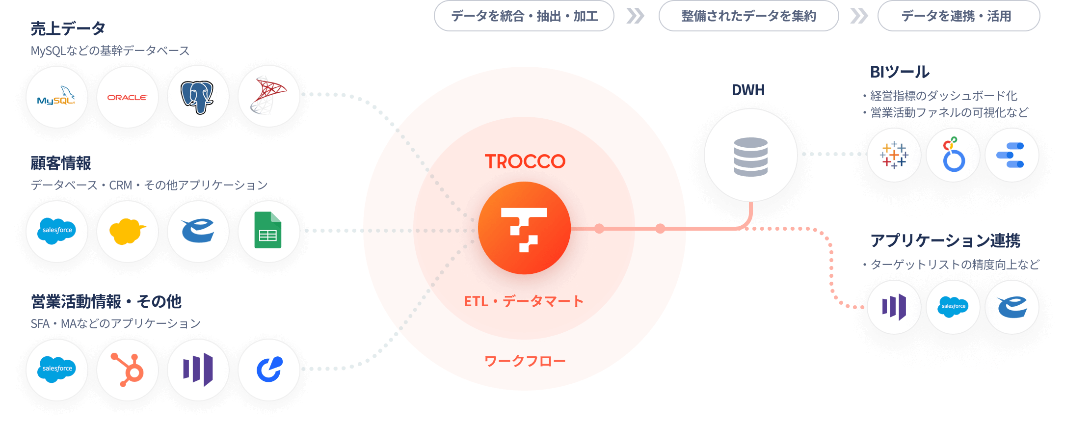 TROCCO®は、営業で利用しているCRM・SFA(Salesforce・kintone・eセールスマネージャーなど)だけではなく、MySQLなどの基幹DBに保存されている