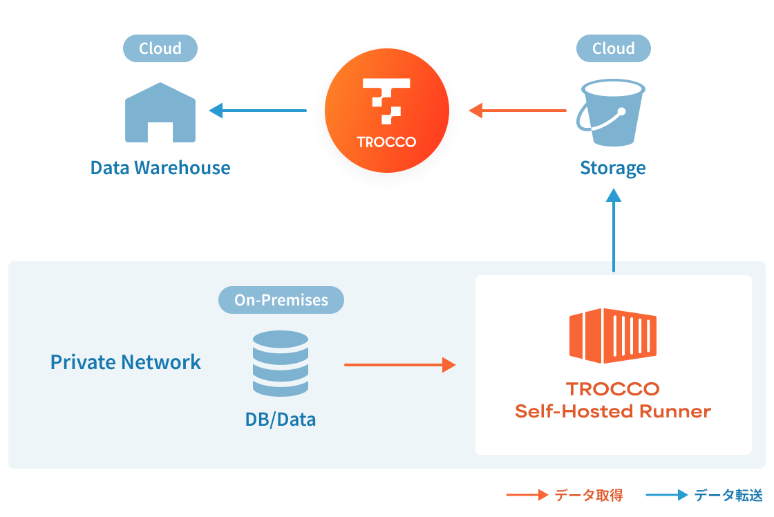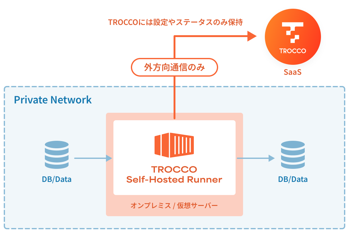 Self-Hosted Runnerは外部方向へのデータ送信のみを行う設計で、お客様環境へのTROCCOからの通信が発生せず、厳しいセキュリティ要件の環境へも導入が可能。