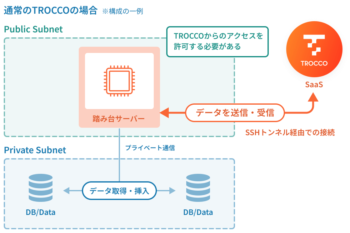多くの場合、ユーザーのデータソースは外部から直接アクセスできないプライベートネットワーク上にあります。プライベートなネットワーク上にあるデータソースへアクセスし、データを取得したりデータを挿入したりするには、外部からの接続を受け付ける踏み台サーバーを経由する必要があります。